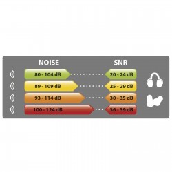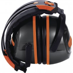 Nauszniki przeciwhałasowe składane z czaszami z ABS. Poduszeczki wyściełane pianką syntetyczną. Podwójny pałąk plastikowy (POM) z regulacją wysokości, wzmocniony oraz wentylowany dla większego komfortu.