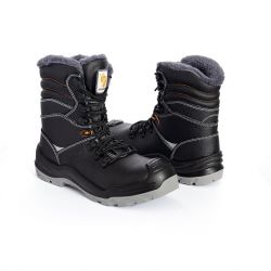 Buty ochronne, ocieplane kożuchem NARVIK S3 SRC. Wykonane z bydlęcej skóry dwoinowej, z wyściółką ocieplającą, metalowym podnoskiem ochronnym odpornym na uderzenia z energią 200 J i zgniecenia 15kN oraz stalową wkładką zabezpieczająca stopę przed przekłuciem o nacisku 1100N. Podeszwa z dwugęstościowego poliuretanu PU/PU, antyelektrostatyczna, antypoślizgowa i olejoodporna. Absorpcja energii w części piętowej. Elementy odblaskowe na bokach. Kategoria S3 SRC. Spełnia wymagania normy EN 20345